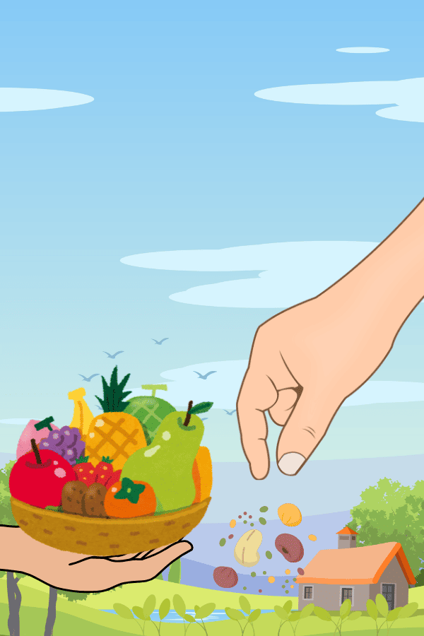 Characters 1 and 2 are gathering fruits and vegetables from the community garden.